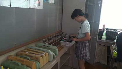今日は、色々な楽器を触り、どんな音が出るのか、どのような素材でできているのかを確かめました。今後は様々な楽器を使って曲を演奏をしていきます。