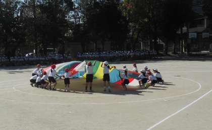 バルーンを手に、子どもたちが心をひとつにして創り上げた団体演技。風に舞うバルーンの動きとともに、笑顔や真剣な表情が輝き、会場全体が温かいしあわせな気持ちに包まれました。