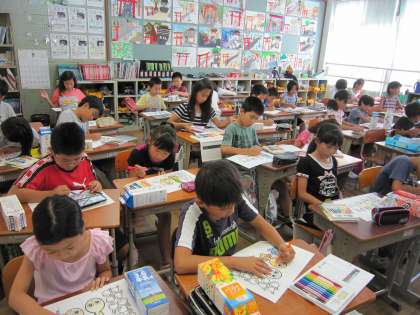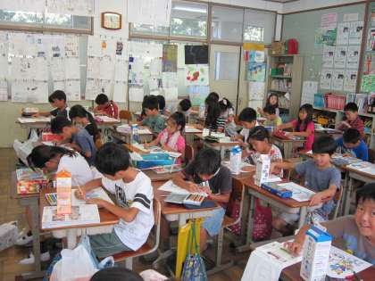 この学習で使う1Lの紙パックを持ち寄り,この日は,持ち寄ったパックの外に張る絵の色をぬっていました。
