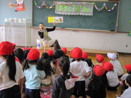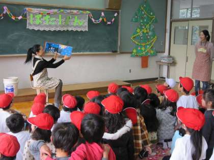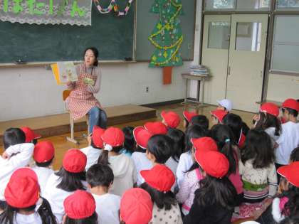この日は,「いろいろサンタのプレゼント」と「サンタさんといっしょに」の2冊の読み聞かせでした。子ども達は,本の挿し絵を懸命に見つめながら,読み声に耳を傾けていました。