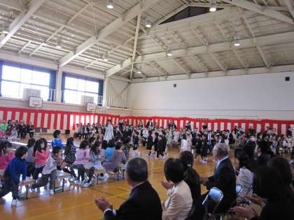 入学式の中で,学校長は「あいさつ・返事の名人,早寝早起き・朝ごはんの名人,仲良し名人 この3つの名人になろう。がんばってくださいね。」と語り掛けました。