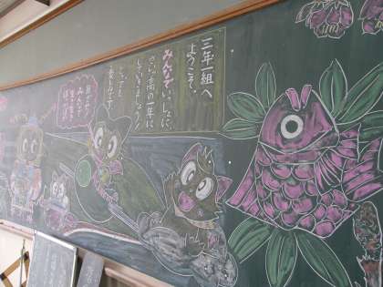 別のクラスでは担任の先生が気合がすごい!あいさつ代わりのメッセージ(絵)が黒板に書かれていました。ものすごい力作で「2時間くらいかかりました。」とのことです。