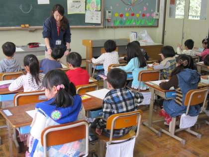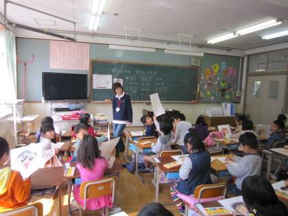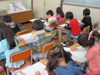 1年生は,自分の顔を描いています。耳はどこかな鼻はどこかなと考えながら描いていました。描けた子は先生や友達に見せていました。