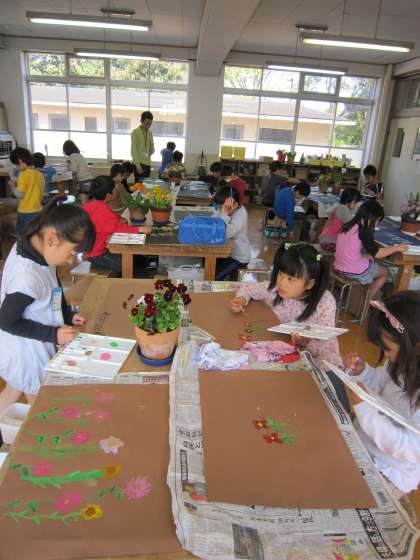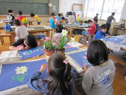 3年生は,花の絵を描いています。いろいろな種類の花の中から自分の描きたい花を決めて描いています。