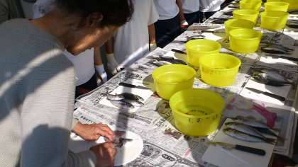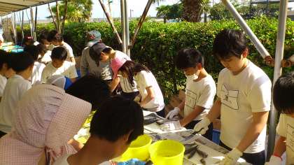フェリーに乗って日間賀島に着きました。あじの干物づくりに挑戦しました。