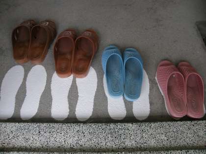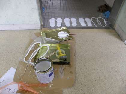 北校舎と中校舎のトイレにスリッパの置き場所の足型をペンキで描いています。子どもたちには,担任から「ここにピタリとこのように置きます。もし散らかっていたら自分がやったのではなくてもそろえておくようになってほしいな」という話をしてもらいます。