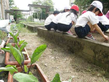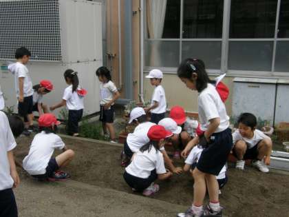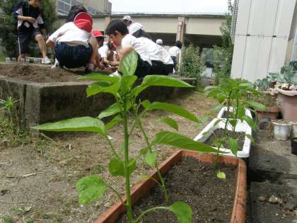 2年生が花壇の土の手入れをしていました。プランターには,ピーマンやミニトマト,ナスを植えていました。これからどんなふうに育っていくのか楽しみです。