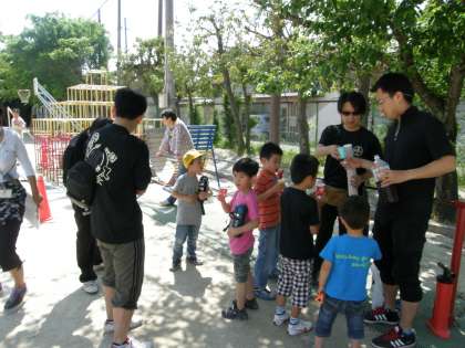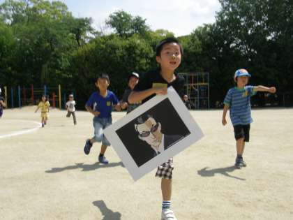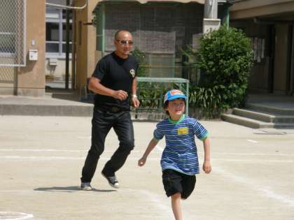 「40周年あらひがで逃走中」が盛り上がっています。黒いTシャツのおやじの会のお父さんたちが中心になってハンターとなり,子どもたちを追いかけています。とっても暑そうです。
