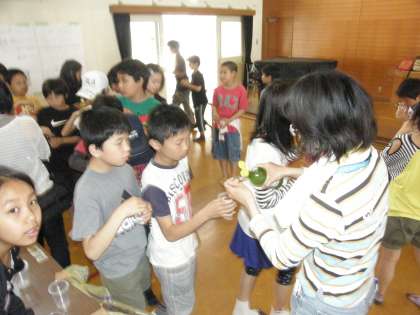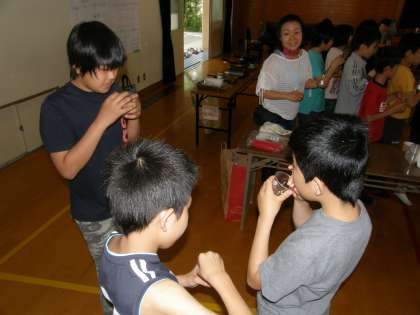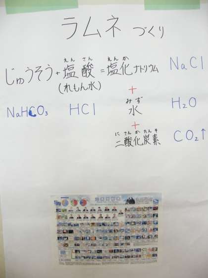 「それラムネの味する?」「うん,するわ」ラムネ作りは二酸化炭素などいくつかのものを混ぜて作ります。子どもたちは液を混ぜながら,みんな神妙な顔をして味わっていました。