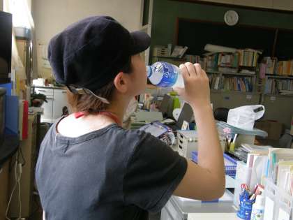 今日は暑いのでハンターさんは大変です。職員室でポカリスエットを飲んでいる女ハンターを見つけました。