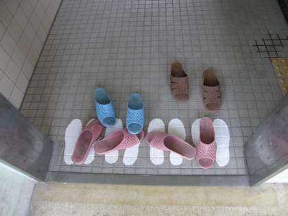 全校のトイレに管理用務員さんが1つ1つペンキでスリッパの足形を描きました。その後見ていたら,ずいぶんきれいに並べられる児童が増えてきたようです。