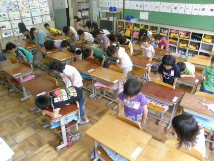 1年生の教室をのぞきました。全員が立って気をつけできるまで,担任の先生がとても根気よく待ち続けています。やっとみんなの気持ちが一つになったところで,「これで○○の時間を終わります」「はい!」の元気なあいさつ。こういうことを一つ一つ積み重ねていくことが大切です。