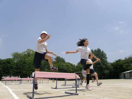 初夏の気配がする運動場。4時間目は5年生がハードル走の練習です。ハードル走は頭の上下動が少ないほどよいそうです。