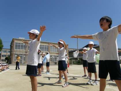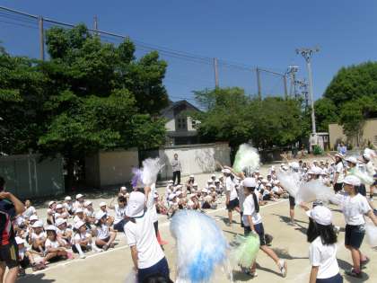 応援団の子どもたちは互いの様子が気になるらしく,赤組も白組も相手の応援席をちらちら見ていました。面白いですね。