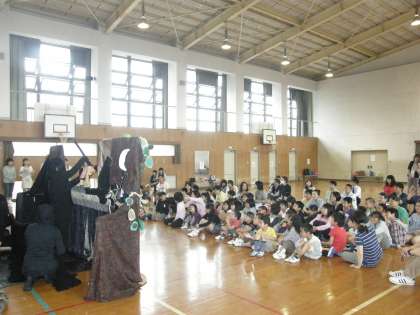 プログラムのトップは「おはなしをたのしもう」で松尾小学校の図書ボランティアのもこもこさんが『めっきらもっきらどーんどーん』を人形劇で見せてくださいました。とても楽しくみんな見ていましたね。