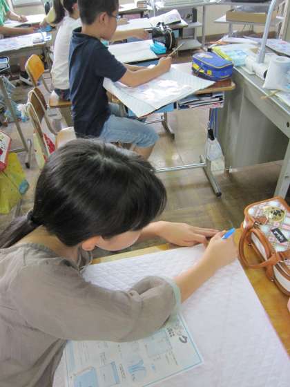 今日は,ぬいしろ・口あきどまりなどの言葉の意味も教わりながら,作り方の説明を聞いた後,印をつけました。
