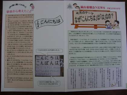 朝会NEWS野第2号を本日お配りしました。「気持のよいあいさつをしましょう」を4月以来ずっと言い続けていることです。が,なかなか簡単なことではありません。今日はちょっと違う角度から迫ってみました。朝会を参観に来て下さった保護者の方もおられます。どうぞいつでもお越しください。お待ちしています。