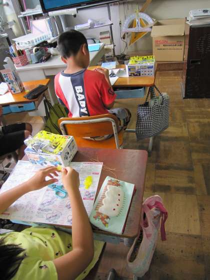今日は,ビニル導線を部品につなごうとしていました。小さな部品に導線をつなぐので苦労している子もいるので,担任が一人ひとり接続を確かめていました。