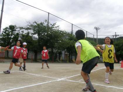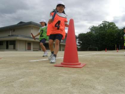 曇り空の運動場からにぎやかな歓声が聞こえてきます。2年生のおりかえしリレーが行われていました。走力の近い4人ひと組のチームが,走る順番やバトンパス,コーンの曲がり方などを工夫して勝敗を競います。喜んだり悔しがったり…。子どもたちの百面相が見られました。