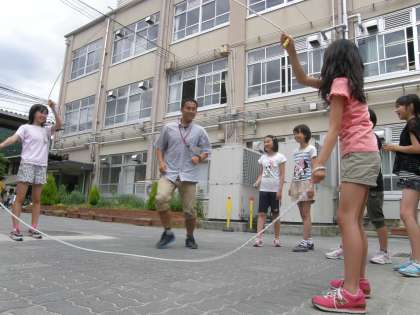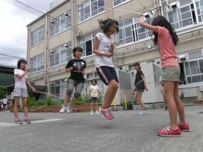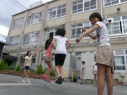 中間休みに6年生の女子が楽しそうに縄跳びをしていました。よく見ると長縄2本のダブルダッチです。これは難しい!そばで見ていた先生もやってみましたが…。それにしてもお見事ですね。