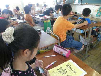 5年生ではどちらのクラスも明日のことについて確認をしていました。2組は面白いことで盛り上がっていました。