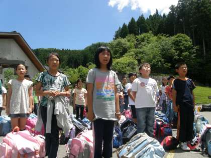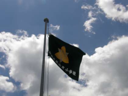 早速の入所式。期待と不安の中で始まりました。青空にはためく嵐山東校の校旗のもと,