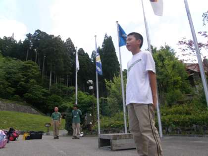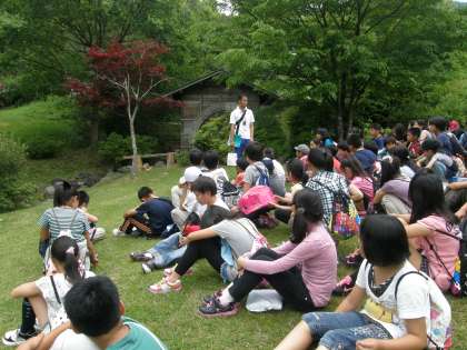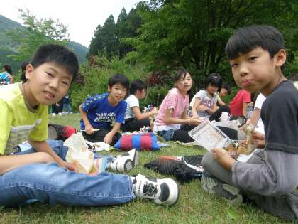 入所式の後は各部屋に荷物を入れて,水車小屋付近に集合。おいしい空気と共にお弁当をいただきま〜す!