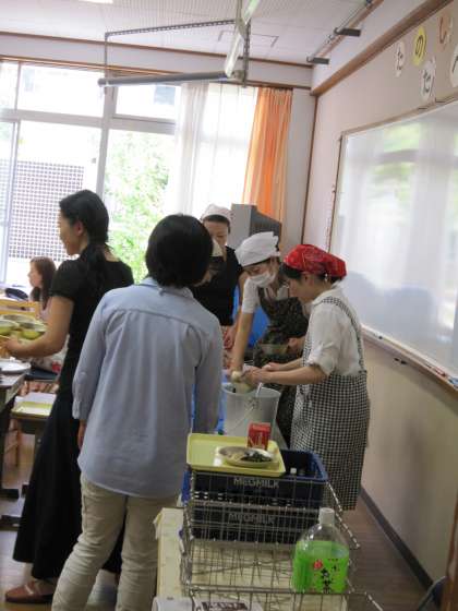 給食試食会は,栄養教諭のお話を聞いた後,1年生の給食時間を参観してもらいました。子ども達は大喜びで,手を振ったり笑顔で話しかけたりしていました。