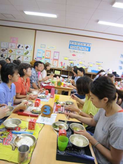 そして,ランチルームでの試食が始まりました。学校給食を懐かしそうに食べておられました。これをきっかけに,食についておうちでもお話しいただければと思います。