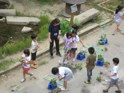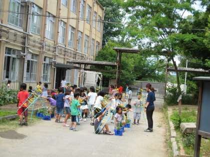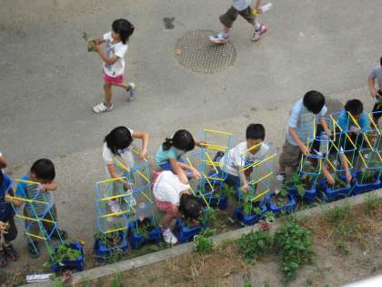 1年生は,アサガオを育てています。そのアサガオが成長してきたので,今日は,支柱を立てました。