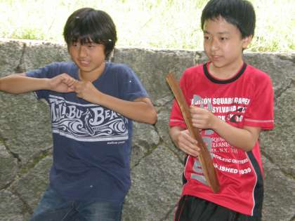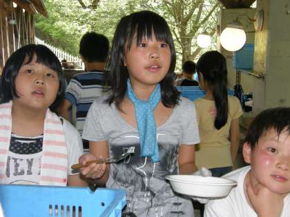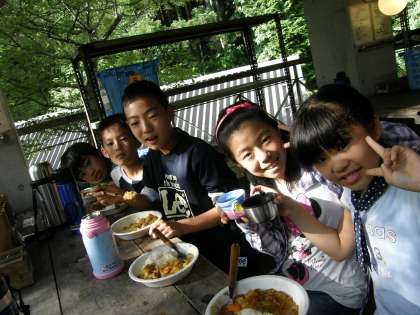 苦労して作ったカレーがやっとできました。とは言っても,できた班から「いただきます!」なのです。