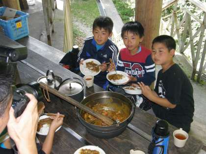 カレーで一番難しいのが水加減のようです。子どもたちのそれはグループによって千差万別…。「俺,スープカレー好きやし。これでええねん。」と言っている子もいました。
