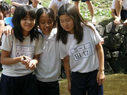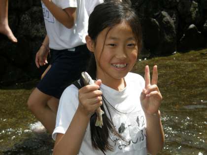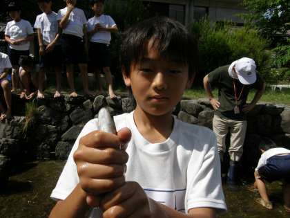 とった岩魚はバケツに入れておきます。それがこのあとのお昼ごはんになるのです。