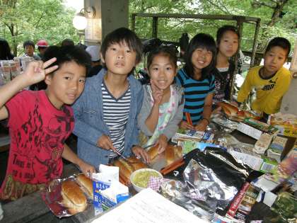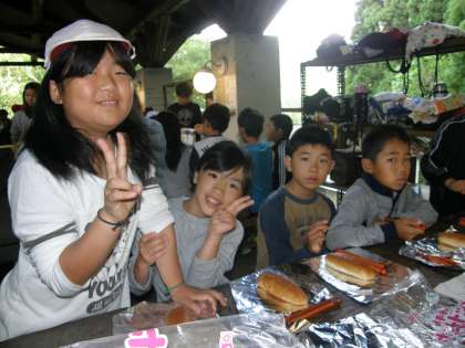 魚つかみの前には,朝ごはんで「パックドック」をしました。ソーセージや味付けキャベツをパンにはさみ,アルミホイルで包んで,牛乳パックの中に入れます。それに火をつけると焼き芋のような感じになって出来上がるというわけです。