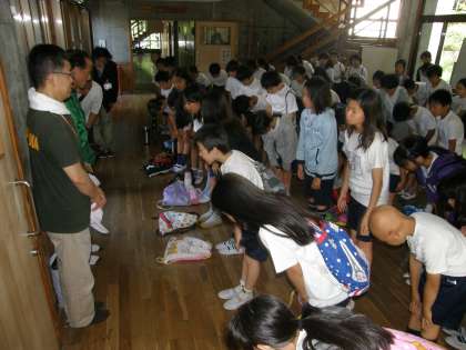 魚つかみの前には,昨日に続いて少年補導からお二人がボランティアで来てくださいました。今回はお世話になる方,なった方に対して「礼儀を尽くす」ことを強調しています。今の子どもたちには大切に考えてほしいことです。