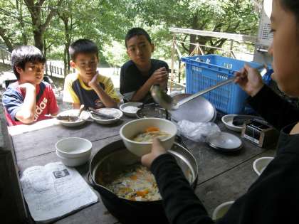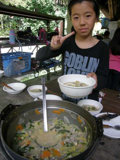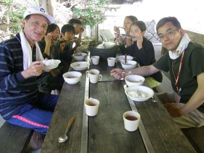 具だくさんの豚汁ができました。「さぁ,召し上がれ」「いただきま〜す」ボランティアのお二人にもいろいろとお世話になりました。どうぞ…。