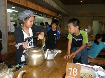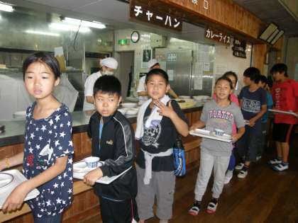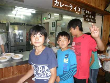 最後の食事です。カレーライス・チャーハン・うどんと炊き込みごはんの中から一つを選びます。さらに,副食のバイキングとして,ミンチカツやシューマイ,小芋のたいたん,ホタテフライ,ケチャップ煮,野菜各種があります。堪能していたようです。