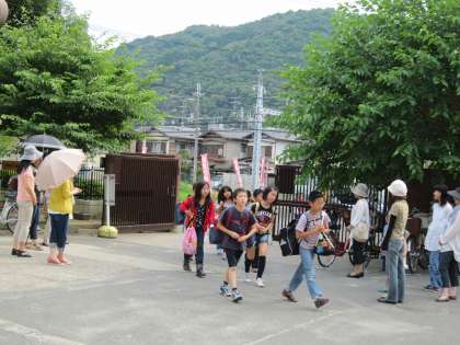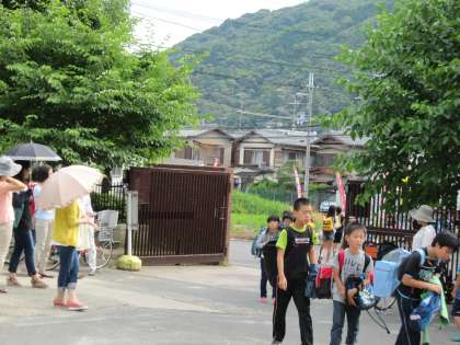 たくさんの保護者の皆さんに迎えられながら学校正門をくぐった子ども達です。