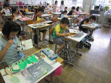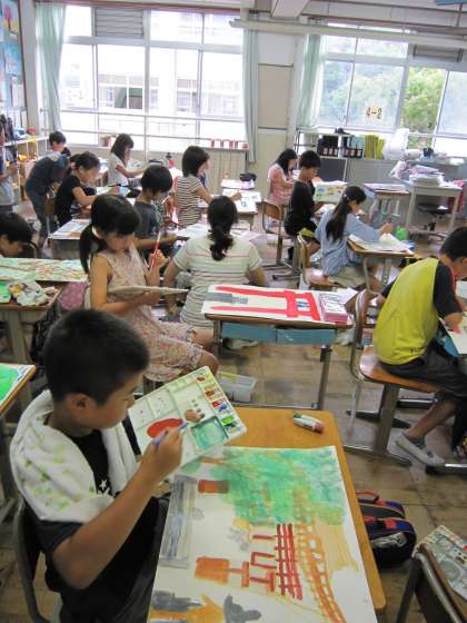 写生した絵に,学校で色付けをしています。
