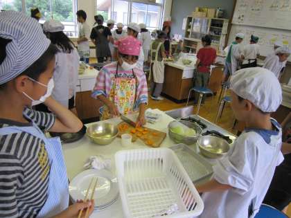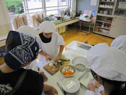 子ども達は,協力しながら野菜を切ったり洗ったりした後,いためます。