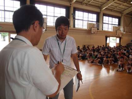 今日の訓練も本日の個々の引き渡し状況を確認しながら進めていきました。そのあとで教室で子どもたちには指示を出します。そして,移動した体育館でもさらに全体に指示を出します。