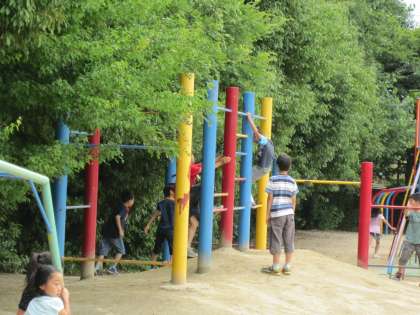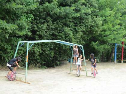 一輪車に乗ったり遊具を使って楽しんだりしています。