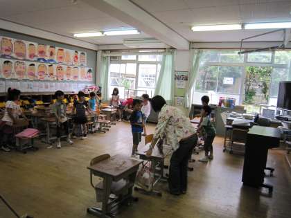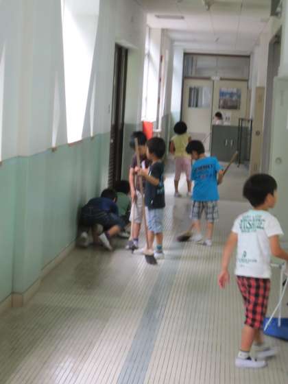 1年生は,6年生に掃除の仕方を教えてもらった後,自分たちで掃除をしています。
