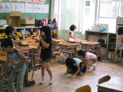 掃き掃除に拭きそうじと,みんなで協力しながら,しっかりと掃除をしています。