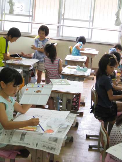 次には,絵の具で色をつけていきます。「先生 ここに緑色を塗ってもいいですか。」「いいよ。緑色は,どうして作るといいのかな。自分で色を作っていこう。」という声が聞こえてきました,これから,色を作りながら,色をつけていくのです。どんな作品になっていくのか,とても楽しみです。