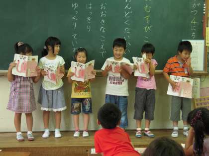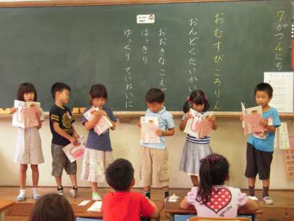 「おむすび ころりん すっとんとん ころころ ころりん すっとんとん」のリズムが楽しい「おむすび ころりん」の音読大会をしました。グループのなかで読むところを分担してひとりずつ順番読みました。声の大きさや読む速さに気をつけて,はっきりと読むことをめあてにして発表しました。みんなの前で読むのは初めてでしたが,毎日宿題で音読の練習をしている成果がしっかり出て,どのグループも上手に読むことができました。