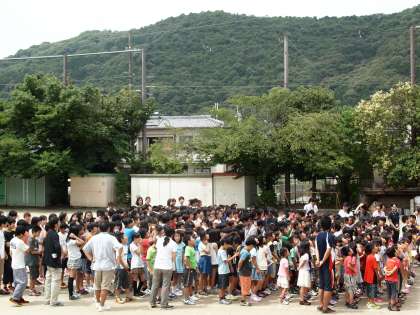 航空写真はクリアファイルになって無料でプレゼントされます。40周年記念事業の一環です。空撮の後は本館の前に全員が移動しました。