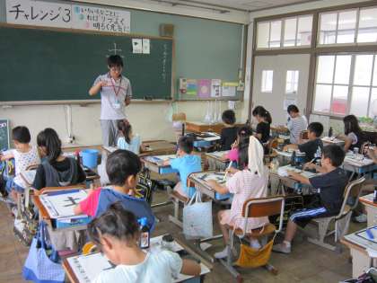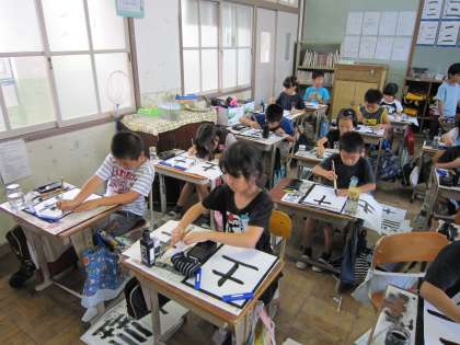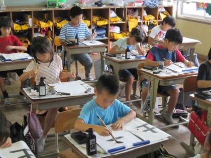 今日は「土」という字を練習しました。はじめ水をつけた筆で文字をなぞり,つぎに文字の輪郭だけが書かれたものをなぞり,最後に半紙に書きました。