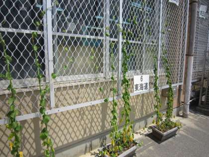 本校本館に南で育てているあさがおが花を咲かせていました。