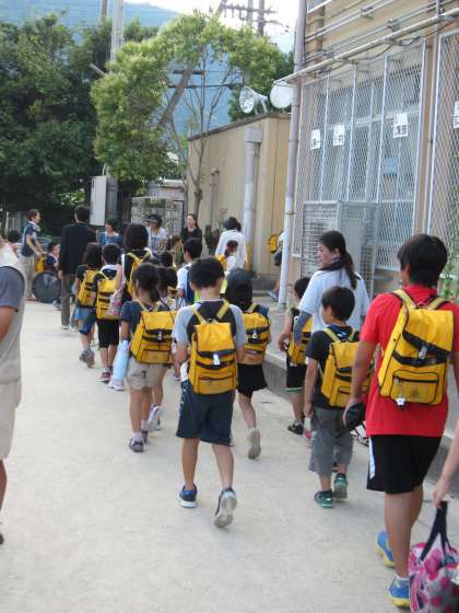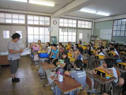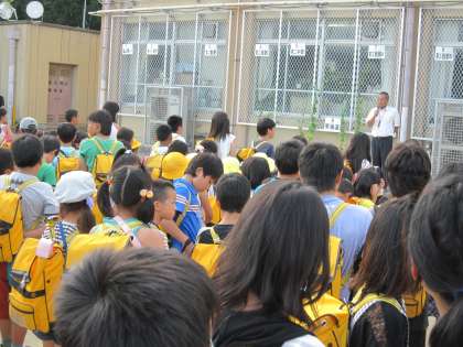 それぞれのブロックで,集団登校の集合場所や集合時刻,歩き方について反省し,集団登校では道に広がらずに歩くようにと指導しました。その後,地域委員さんから夏休み中のラジオ体操など町内での行事について話していただきました。